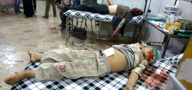 جثة طفل توفي وهو يتلقى العلاج إثر إصابته بغارة لقوات النظام على مدينة دوما بريف دمشق. إي.بي.إيه