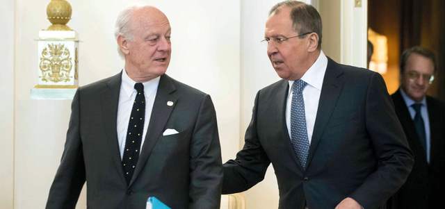 لافروف أكد لدي ميستورا أن الشروط للانتقال إلى حوار مباشر بين المعارضة والنظام السوري لم تتوافر بعد. أ.ب