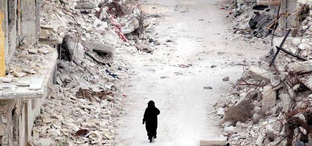 سيدة تمر وسط المباني المدمرة في منطقة معرة النعمان بمحافظة إدلب. رويترز