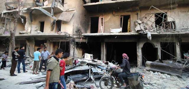 سوريون يقفون على حجم الدمار في حي الصاخور بحلب نتيجة غارات النظام. رويترز