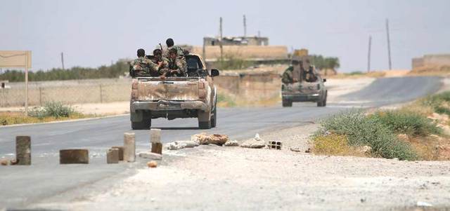 عناصر من قوات «سورية الديمقراطية» على متن سيارتين بالقرب من منبج. رويترز