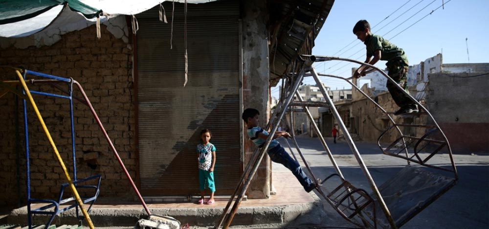 أطفال سوريون في منطقة الدوما الخاضعة لسيطرة المعارضة يلعبون بأرجوحة احتفالاً بالعيد. رويترز