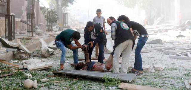 سوريون يحملون جريحاً أصيب في قصف النظام لأحياء حلب. أ.ف.ب