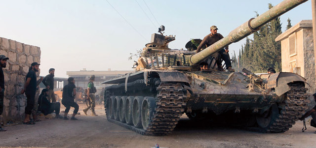 مقاتلو المعارضة يركبون دبابة في كلية المدفعية جنوب حلب بعد طرد قوات النظام منها. رويترز