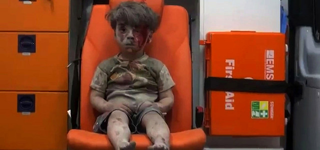 الطفل السوري عمران دقنيش في سيارة إسعاف بعد تعرض منزله في حي القاطرجي بحلب للقصف من قبل النظام. رويترز