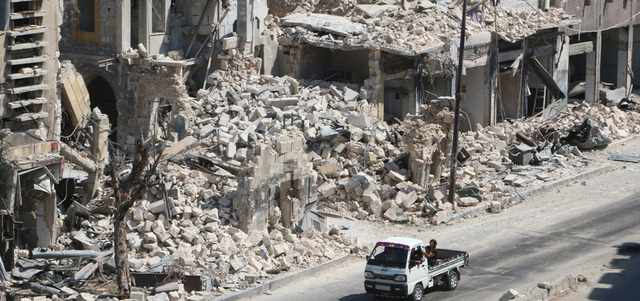 سيارة تمر وسط الدمار في حلب نتيجة غارات النظام على المدينة. رويترز