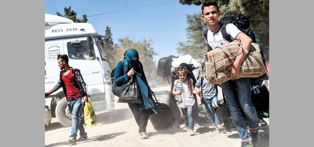 لاجئون سوريون عائدون إلى بلدة جرابلس الحدودية مع تركيا. أ.ف.ب