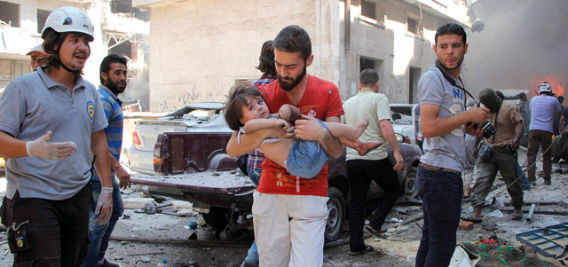 سوري يحمل طفلاً تم إنقاذه بعد قصف النظام لمدينة إدلب. أ.ف.ب