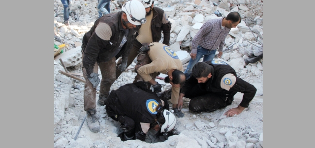 عناصر من الدفاع المدني يبحثون عن ضحايا وسط أنقاض مبانٍ دمرت بغارات للنظام على بلدة كفرتخاريم بمحافظة إدلب. أ.ف.ب