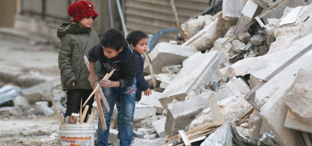 أطفال وسط الدمار الذي خلّفته غارات النظام في حي الشعار بحلب. رويترز