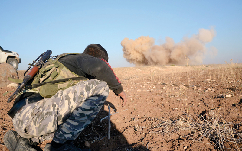 مقاتل من المعارضة خلال عملية تفجير لغم أرضي زرعه «داعش» بقرية قرب بلدة دابق بريف حلب. أ.ف.ب
