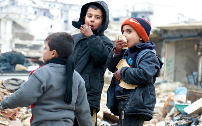 أطفال سوريون يأكلون الخبز بانتظار أن يتم إجلاؤهم من شرق حلب. رويترز