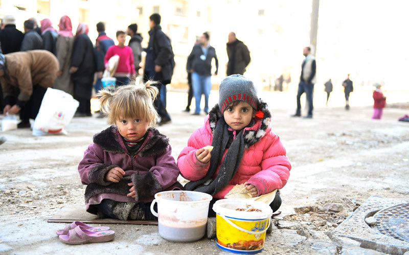 طفلتان سوريتان تأكلان وجبة قدمتها الأمم المتحدة في حي طريف الباب بحلب الشرقية. رويترز