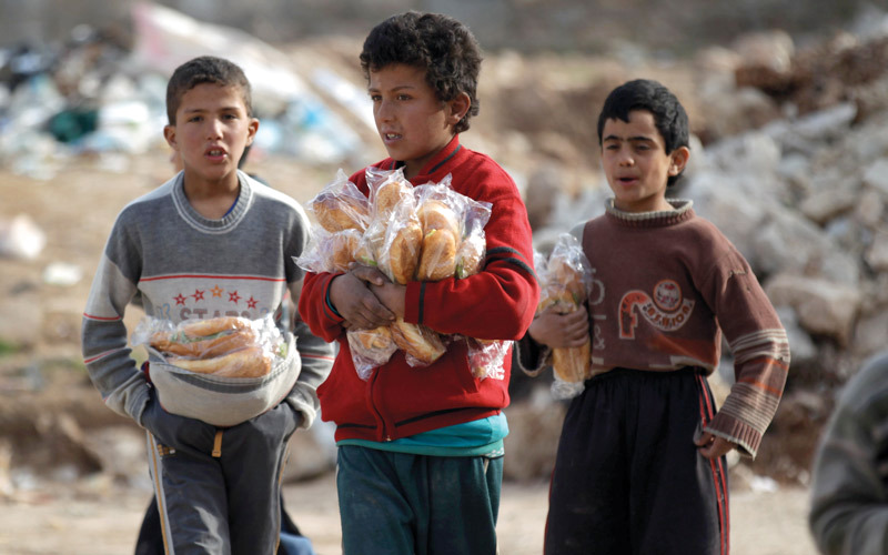 أطفال يحملون «السندويتشات» قرب أنقاض مبانٍ في بلدة الراعي شمال حلب. رويترز
