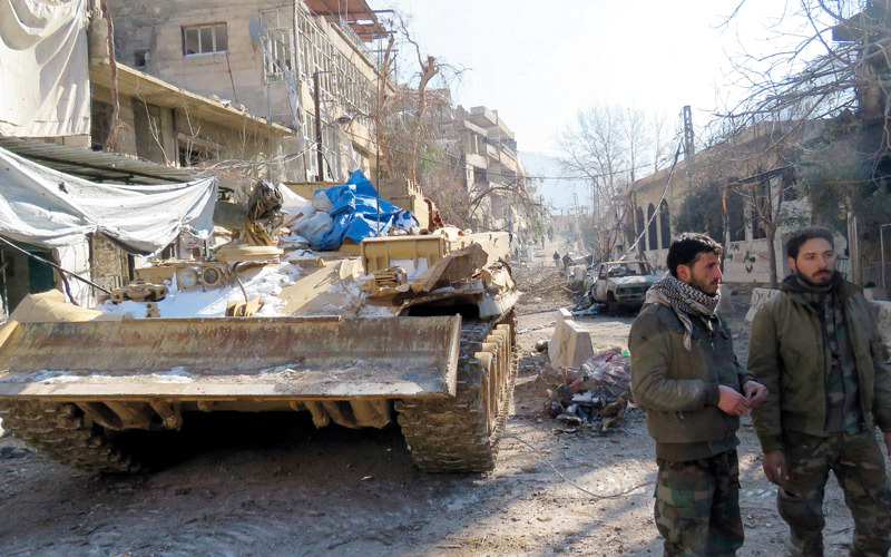 عنصران من القوات السورية في بلدة عين الفيجة. رويترز