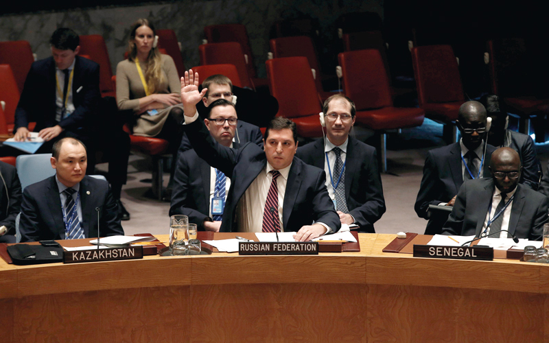 نائب السفير الروسي لدى الأمم المتحدة فلاديمير سافرنكوف يرفع يده معترضاً على مشروع القرار. أ.ف.ب