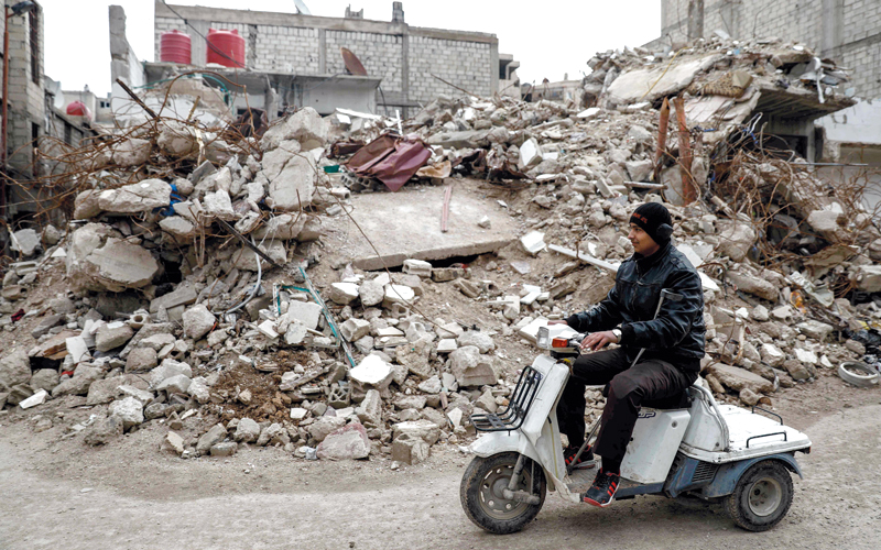 سوري أصيب في ساقيه نتيجة الغارات يمرّ بدراجة بخارية وسط الدمار في مدينة دوما. أ.ف.ب