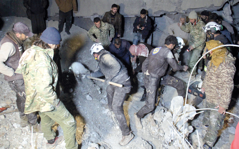 عناصر الدفاع المدني يبحثون عن ناجين تحت أنقاض مسجد دُمر بغارة على قرية الجينة في ريف حلب. أ.ف.ب