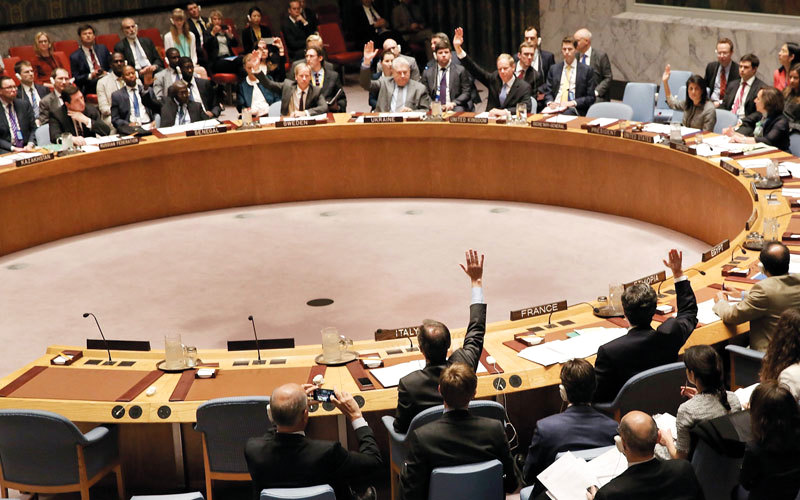 جلسة مجلس الأمن حول مشروع القرار الأممي الخاص بالهجوم الكيماوي في خان شيخون. أ.ف.ب