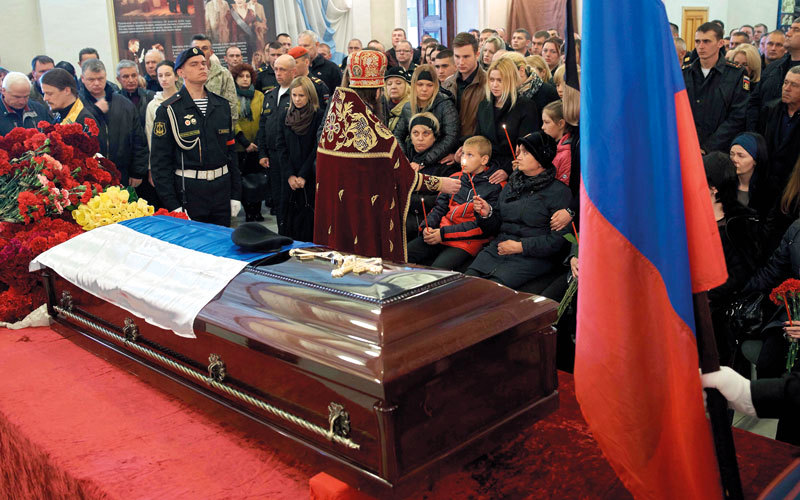 تشييع جندي روسي قتل في سورية بنادي البحارة بمدينة سيفاستوبول. أ.ف.ب