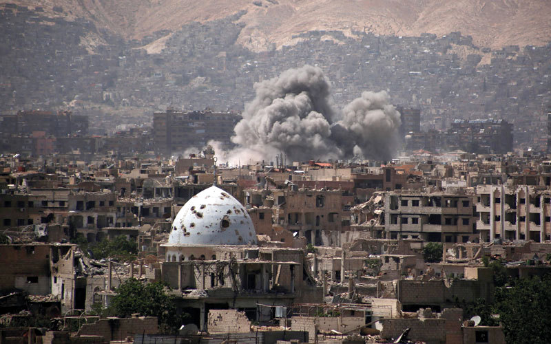 الدخان يرتفع من مبانٍ بعد غارة جوية لقوات النظام على جوبر. أ.ف.ب