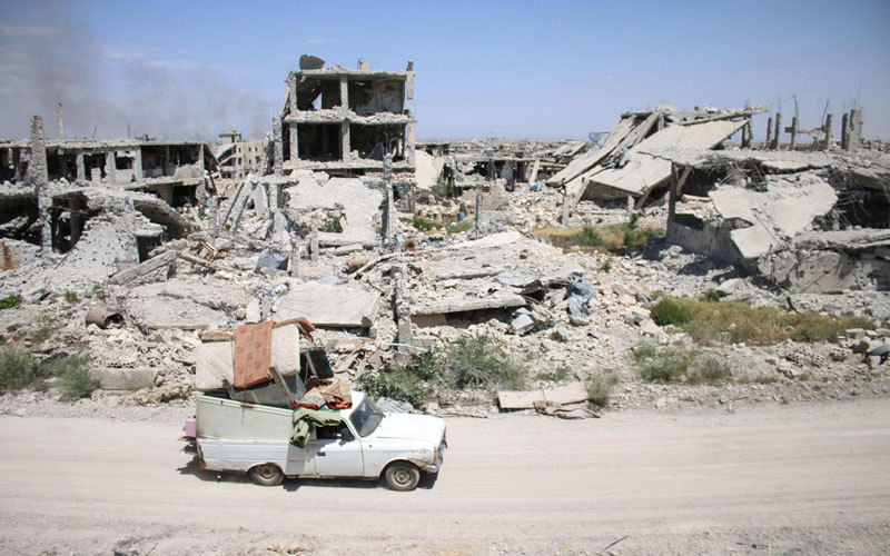سيارة محملة بممتلكات عائلة نازحة تمرّ أمام مبانٍ مدمرة في مدينة درعا. أ.ف.ب