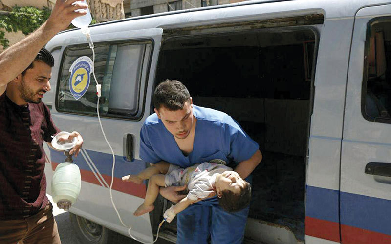مسعف يحمل طفلاً أصيب بقصف لقوات النظام على بلدة حمورية. أ.ب