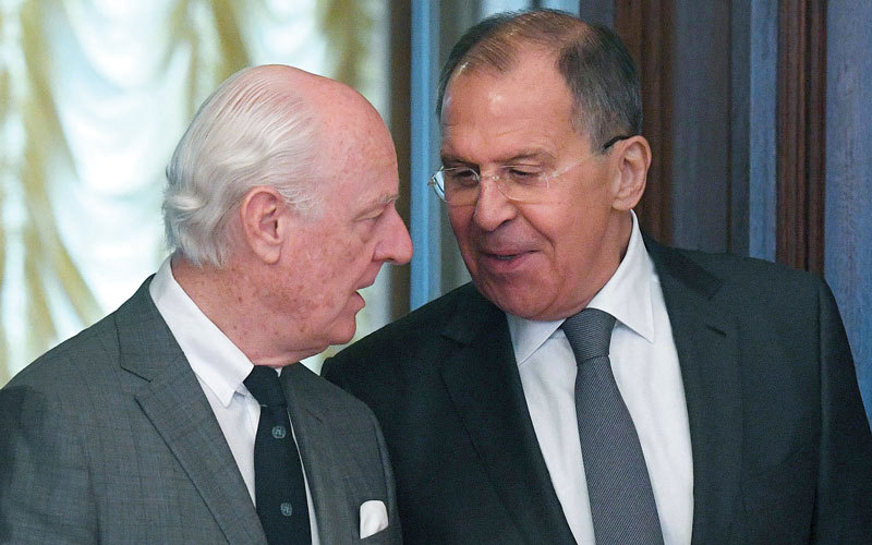 لافروف خلال لقائه دي ميستورا في موسكو. أ.ف.ب