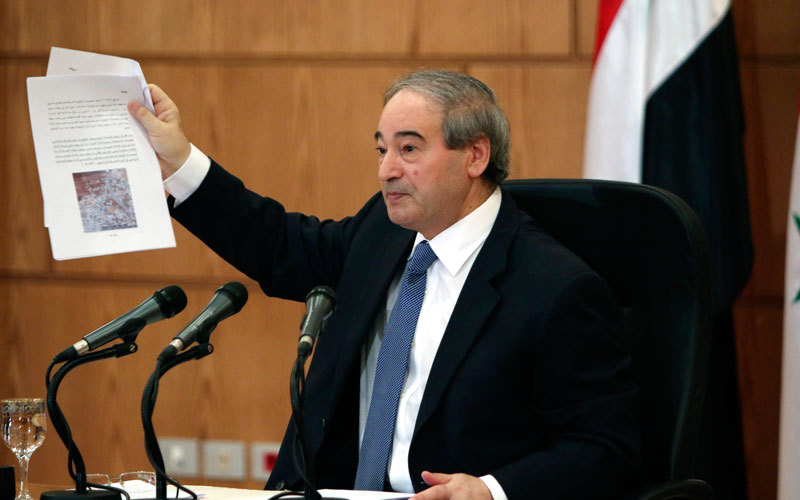 فيصل مقداد خلال مؤتمر صحافي في دمشق. إي.بي.إيه