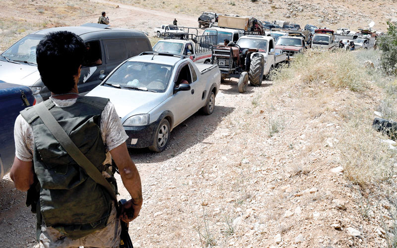 عناصر من «حزب الله» يرافقون قافلة لاجئين سوريين في بلدة عرسال الحدودية. رويترز