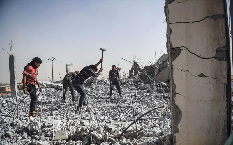سوريون يزيلون ركام منازلهم التي دمرت في معارك واشتباكات الرقة. أ.ف.ب