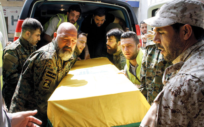 عناصر من «حزب الله» يشيعون أحد قتلاهم في معارك جرود عرسال. أ.ف.ب