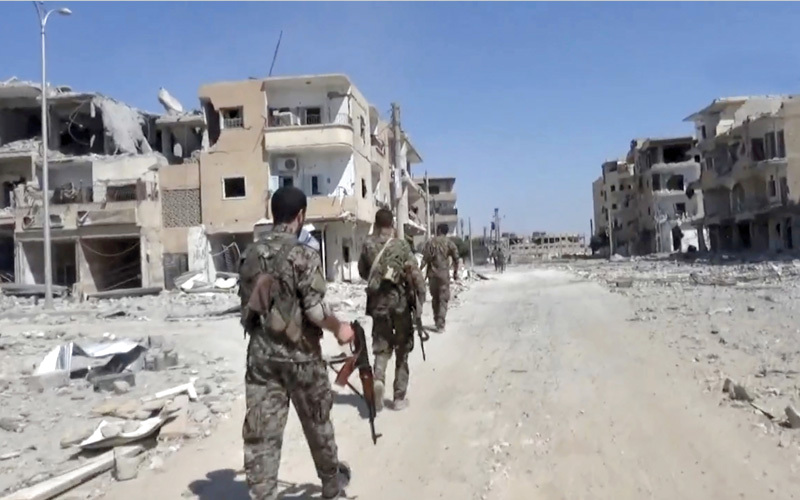 عناصر من «قوات سورية الديمقراطية» في أحد شوارع الرقة. أ.ب
