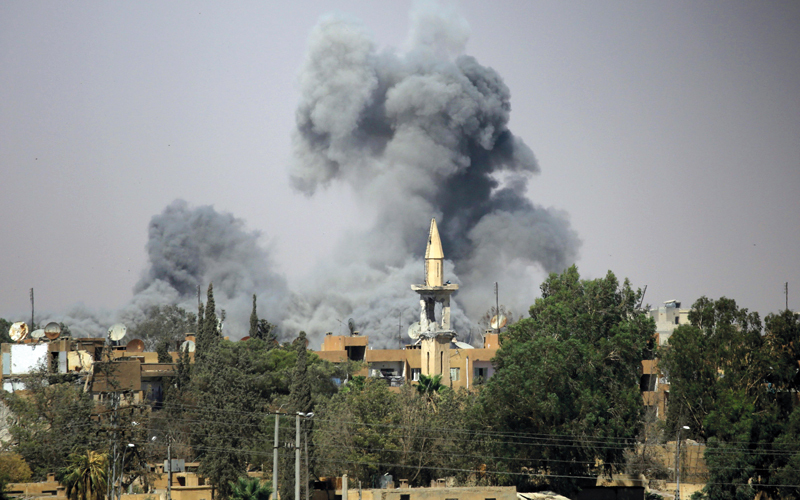 تصاعد أعمدة الدخان من حي الدرعية غرب الرقة خلال معارك بين «قوات سورية الديمقراطية» و«داعش». أ.ف.ب