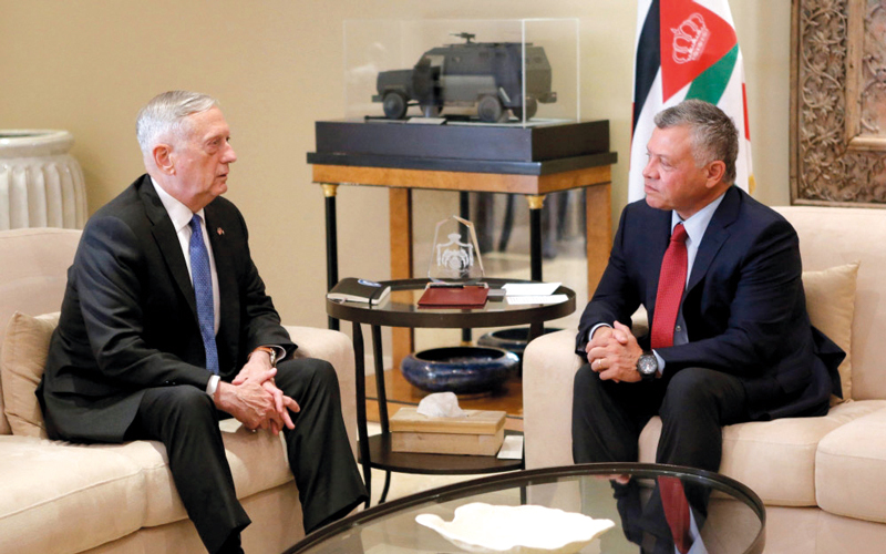 بحث العاهل الأردني الملك عبدالله الثاني، أمس، مع وزير الدفاع الأميركي جيم ماتيس، الأزمة السورية واستراتيجية الحرب ضد تنظيم «داعش» في سورية والعراق.