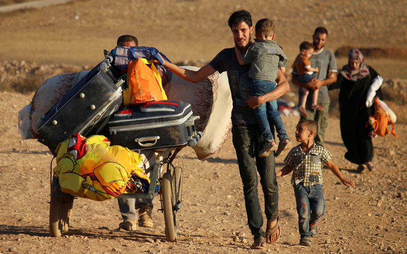 لاجئون سوريون يعبرون الحدود الأردنية عند بلدة نصيب عائدين الي بلادهم. أ.ف.ب