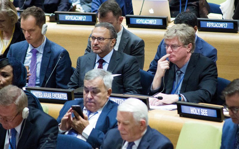 وحرص وزراء خارجية أغلب الدول الأعضاء في هذا الاجتماع على استعراض مواقف دولهم الإنسانية تجاه الأزمة في سورية، والمساعدات المقدمة في هذا الشأن، علاوة على الموقف من مسألة الدعم الذي يتعين تقديمه لسورية بغرض إعادة بناء ما دمرته الحرب في الفترة ما بعد القضاء على تنظيم «داعش» الإرهابي، حيث شددت أغلبية الدول في هذا الصدد على موقفها الرابط ما بين مسألة دعم إعادة بناء سورية بمستقبل نجاح العملية السياسية. وقد التقى قرقاش في مقر الأمم المتحدة أول من أمس، دي ميستورا، حيث استمع إلى إفادة موجزة حول الحيثيات الراهنة للوضع السوري على الأرض، فضلاً عن مستجدات الجهود والمساعي التي يبذلها في إطار ولايته والأمانة العامة للأمم المتحدة لتقريب وجهات النظر بين الأطراف السورية. وعبر قرقاش عن موقف الإمارات الثابت تجاه الأزمة السورية بما في ذلك دعوتها إلى وضع حد نهائي لهذه الأزمة عبر الحل السياسي الشامل، الذي يعبر عن تطلعات الشعب السوري ويؤمن في الوقت نفسه وقف التدخل الخارجي بالشأن السوري. وأبلغ قرقاش، المبعوث الخاص للأمين العام إلى سورية دعم الإمارات الكامل لجميع المساعي والجهود التي يبذلها للدفع نحو إنجاح العملية السياسية الكفيلة بإنهاء الصراع والإرهاب، الذي دمر سورية وزعزع من استقرارها والمنطقة برمتها.