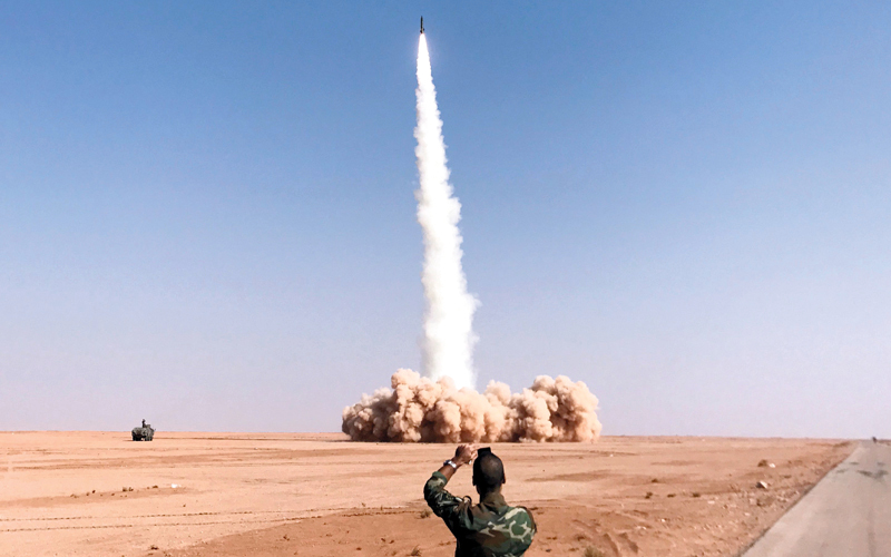 قوات النظام تطلق صاروخاً على «داعش» من قرية الصويعية قرب البوكمال. أ.ف.ب