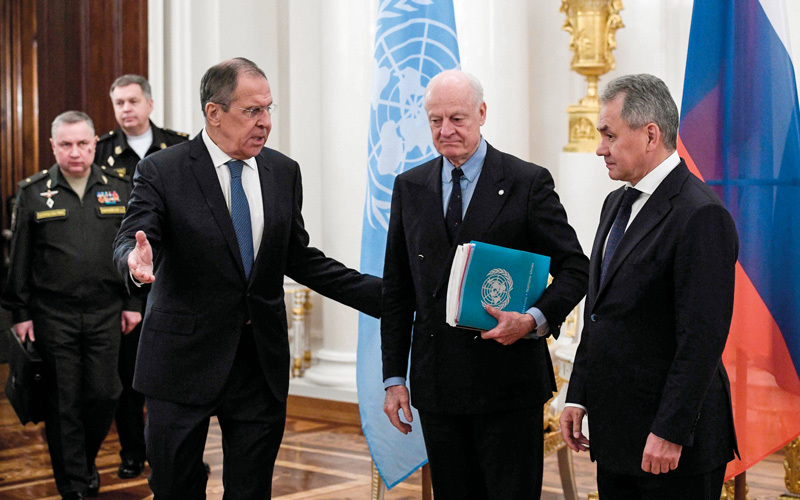 دي ميستورا خلال لقائه لافروف وشويغو. أ.ف.ب