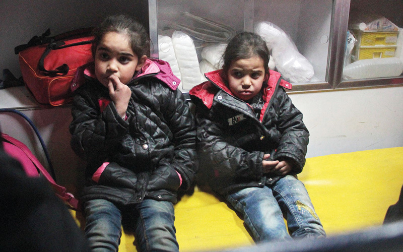 طفلتان سوريتان في سيارة إسعاف لـ «الصليب الأحمر» خلال عملية الإجلاء من الغوطة الشرقية. أ.ف.ب