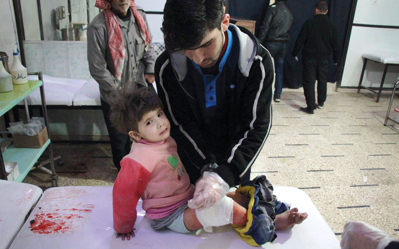 طفلة تتلقى العلاج بعد إصابتها بغارة للنظام على مدينة دوما المحاصرة. أ.ف.ب