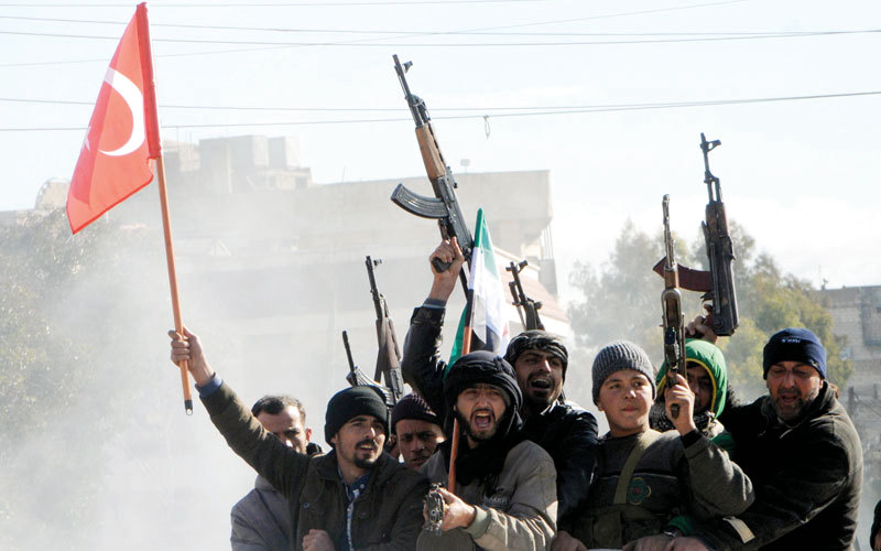 مقاتلون من «الجيش السوري الحر» يتجهون من مدينة إعزاز لمساندة القوات التركية في قتال الأكراد. إي.بي.إيه