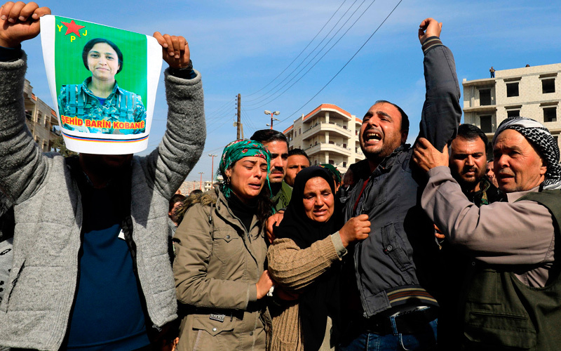 عائلة المقاتلة الكردية بارين كوباني التي تم التمثيل في جثتها من قبل مقاتلين موالين لتركيا خلال مراسم تكريم لها في عفرين. أ.ف.ب