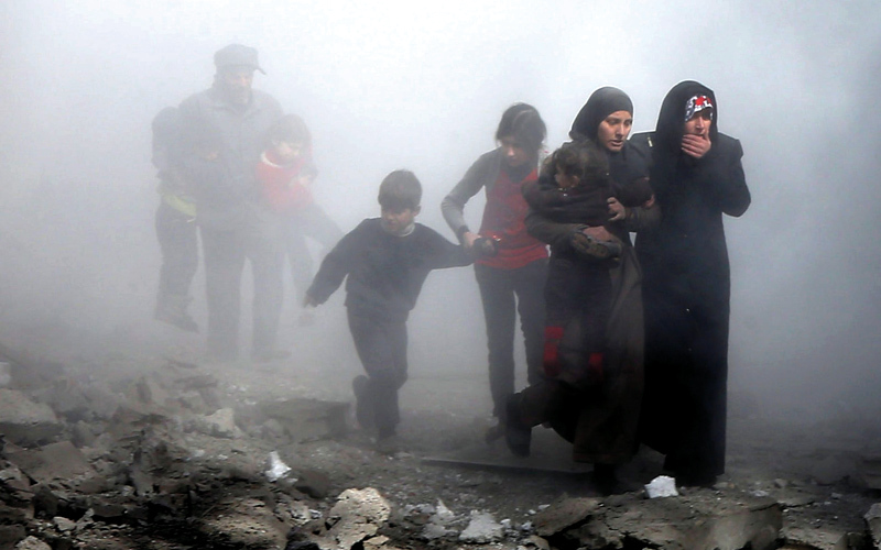 سوريون يهربون خلال قصف قوات النظام على الغوطة الشرقية. أ.ف.ب