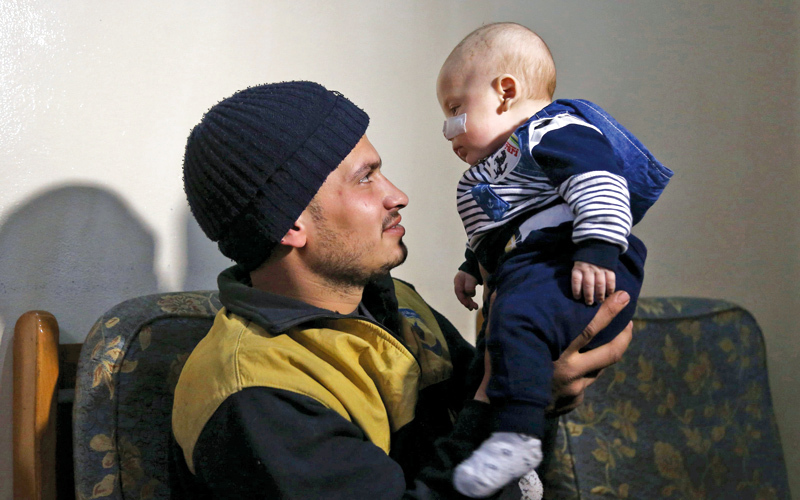 شاب يحمل طفله البالغ من العمر ثلاثة أشهر والذي أُنقذ بعد قصف النظام منزله قبل أسبوع في بلدة سقبا بالغوطة الشرقية. أ.ف.ب