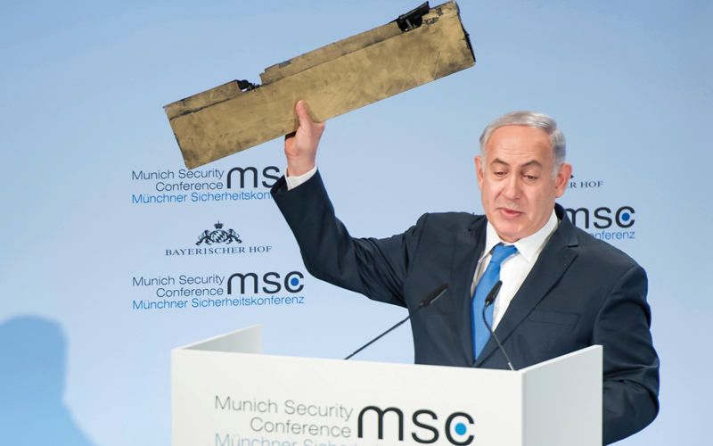 نتنياهو يتحدث في مؤتمر ميونيخ للأمن ملوّحاً بقطعة معدنية قال إنها من طائرة إيرانية بدون طيار أسقطتها إسرائيل. أ.ب