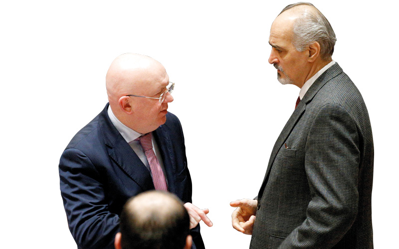 مندوب روسيا بمجلس الأمن في حديث مع بشار الجعفري. رويترز