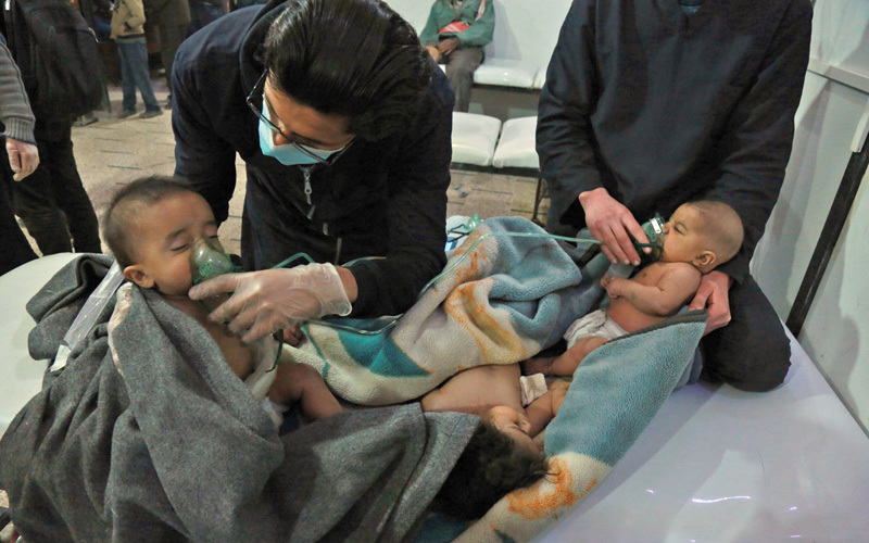 أطفال يتنفسون عبر قناع أكسجين بعد إصابتهم بهجوم استخدم فيه غاز الكلور على قرية الشيفونية في الغوطة الشرقية. أ.ف.ب