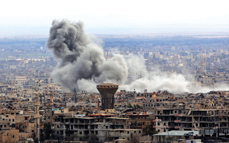 الدخان يتصاعد من الغوطة الشرقية عقب غارات جوية جديدة وإطلاق صواريخ من قبل قوات النظام في خرق للهدنة. أ.ف.ب