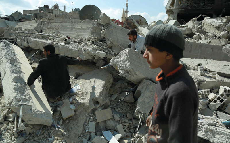 سوريون يبحثون بين الأنقاض عن أحياء في دوما بعد غارات للنظام. أ.ف.ب